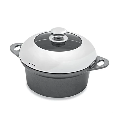 Attention : Poignées conductrices de chaleur, afin d’éviter toute brûlure nous vous recommandons fortement d’utiliser des maniques lorsque vous saisissez le faitout. Vous trouverez le faitout vendu avec ses maniques ici.
